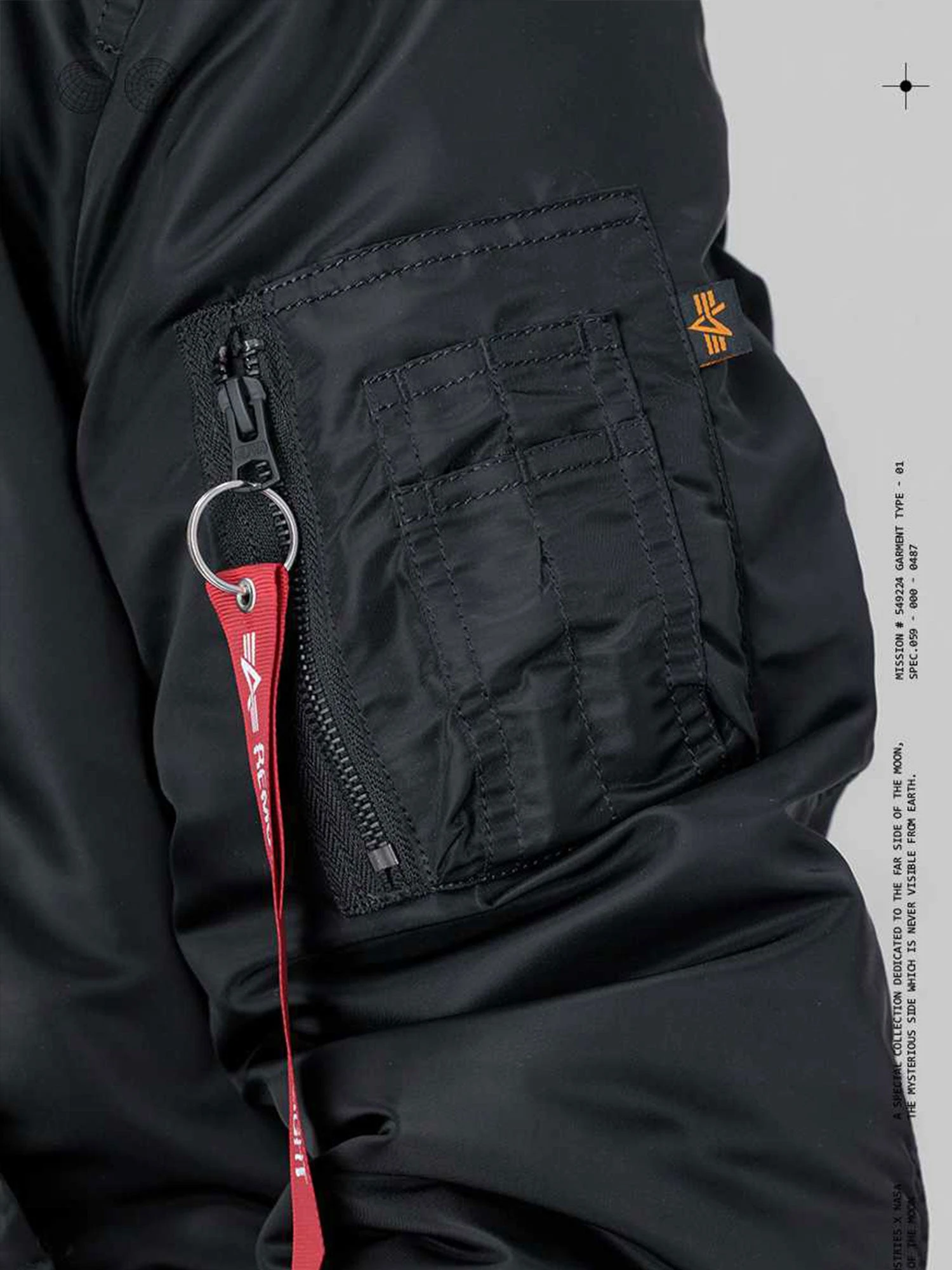 The MA-1 VF Hood Dark Side flight jacket. The embroidered patches on the front with original logos of the Apollo 11 mission and NASA. A special reflective arm pocket with embroidered contrast cuff. Large back print with full moon and lettering.