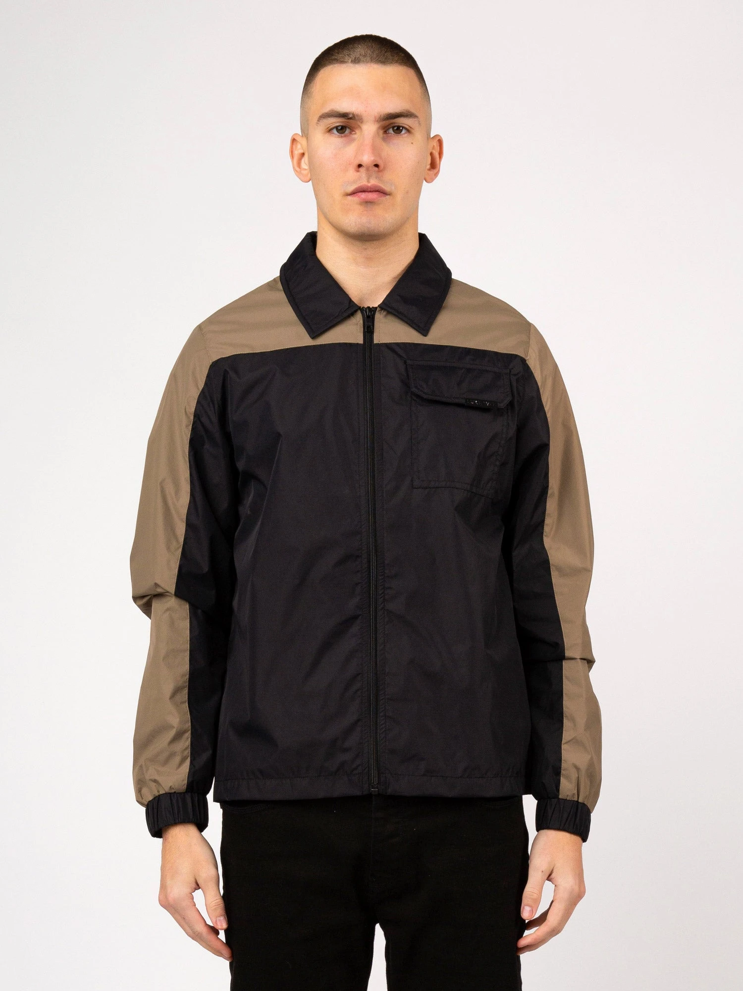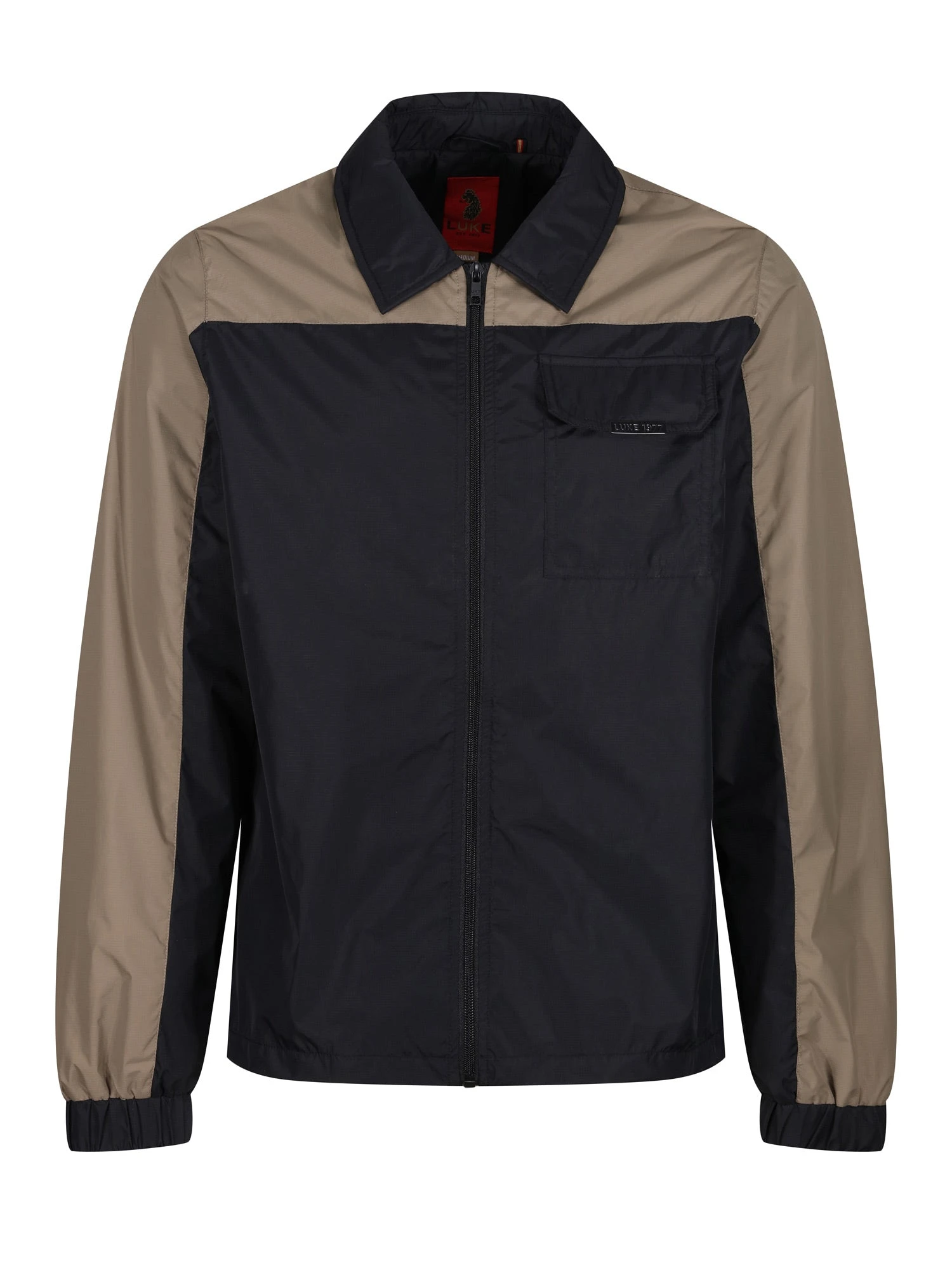 This classic collared jacket from LUKE is cut from a lightweight shower proof nylon and features cut and sew contrast panels. It is fitted with a full zip closure, elasticated cuffs and a chest pocket which is detailed with the LUKE 1977 matte black clip.