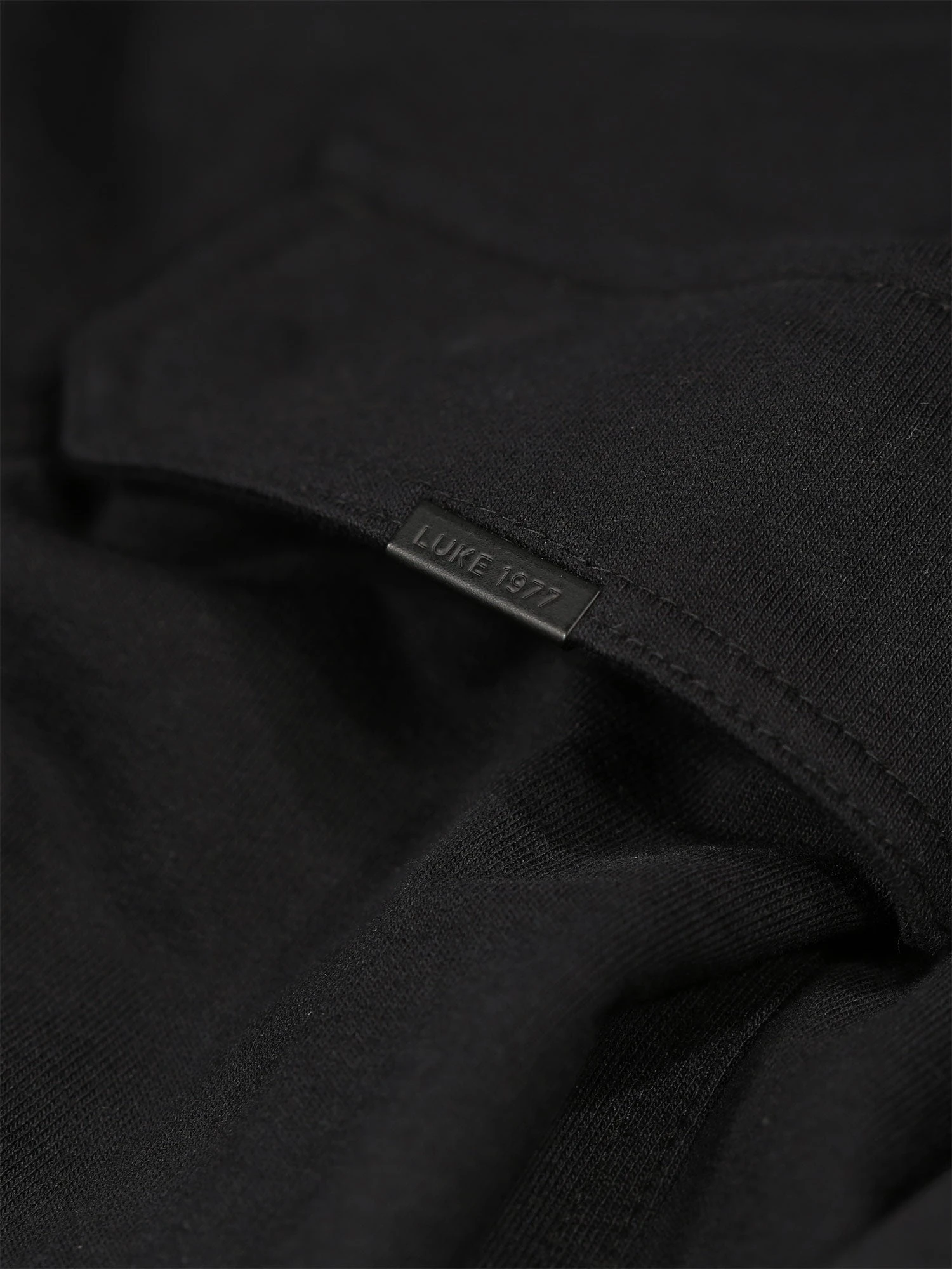 - Matte black LUKE 1977 debossed metal tab