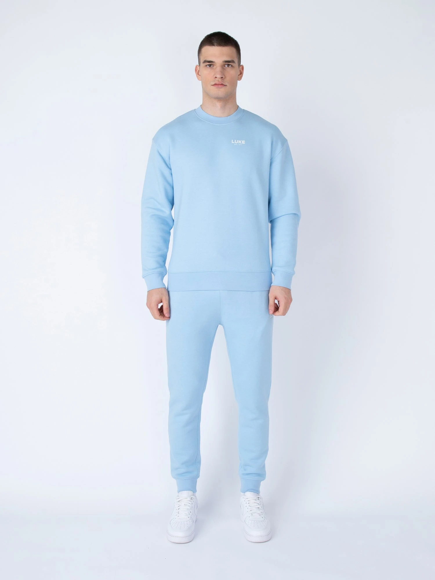 Every casual wear wardrobe needs a classic crew neck sweat & joggers set. Crafted from a super soft premium cotton blend with fleece, it is perfect for staying cosy. Sweat is cut to a relaxed fit and features soft rib trims throughout. Joggers feature a comfy drawcord waist and rib cuffs and are fitted with handy side zip pockets, ideal for all your essentials. The look is then complete with the LUKE EST. 1977 raised text print on the left chest and left leg.