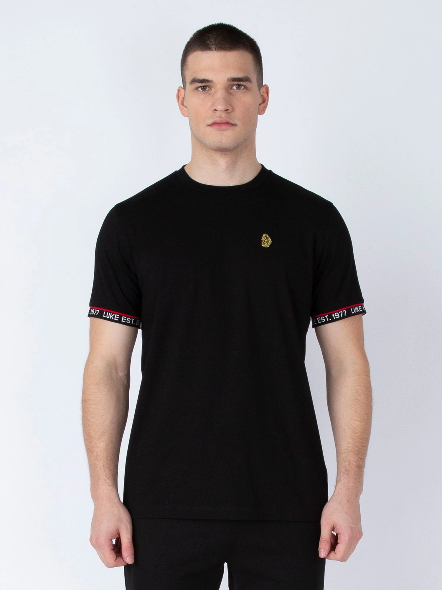 This stylish black tee from LUKE is your go-to this season. Constructed from a luxury cotton blend, it is fitted with a soft rib crew neck and rib cuffs which feature the LUKE EST. 1977 printed text in white and a contrast red stripe. The look is then signed off with the brand’s iconic lion head embroidery on the left chest.Â